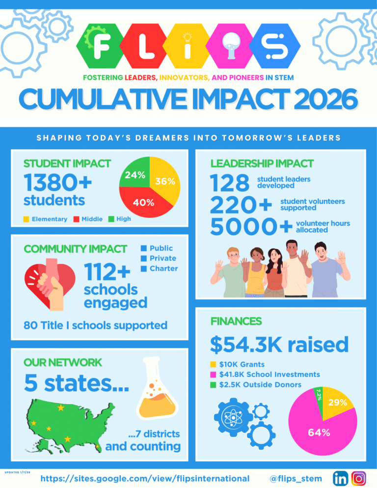 FLIPS targets Title 1 (low-income) communities that don’t typically have access to STEM. With 100% free programming, we believe finances should not be a barrier to accessing STEM leadership opportunities.